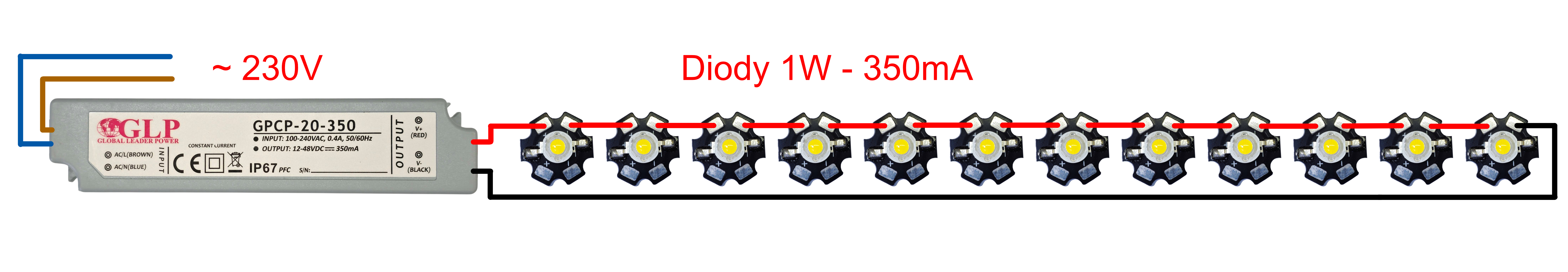 Do drivera GPCP-20-350 diody LED 1W 350 mA podłączamy wyłącznie szeregowo. Wszystkie diody muszą być połączone jedna za drugą, od plusa do minusa ostatniej diody. Każda dioda otrzymuje stały prąd 350 mA, a ich napięcia sumują się.